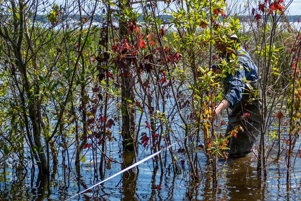 Fifteen minutes later, the trio has moved to the lake’s western shore. They drift to shore, tie up the boat and trudge through dense vegetation. Here, Environmental Scientist Stephen Jennewein, examines soil core samples while Mouzon and Raymond Deschler, also an environmental scientist, stretch a tape measure from a high ridge above the wetland down to the open water 200 feet away.